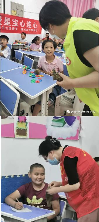 2020年6月23日下午,德州市卫生健康委王新平主任、德州市疾控中心宋洪冰主任携单位的爱心志愿者叔叔阿姨们来到德州新语特教培训学校北校区,为同学们送来端午节的礼物--美味粽子,李国俊校长和两位校区负责人于娟老师、王艺然老师全程陪同。