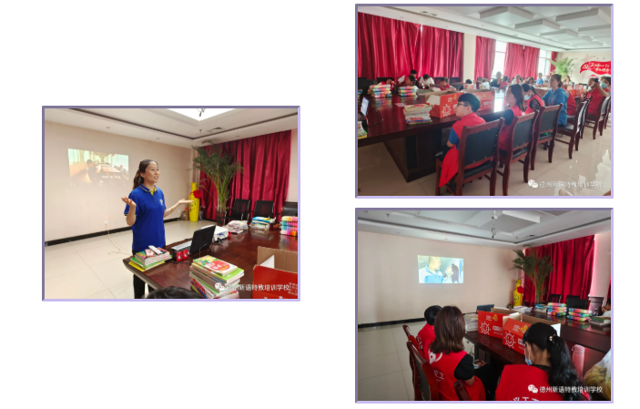 2021年7月15日下午,德州市义工志愿者协会传统文化分会的爱心义工们带着礼物来到德州新语特教培训学校,为同学们送来盛夏的礼物。与往日不同的是,暑期已至,这次来学校的还有许多儿童义工。