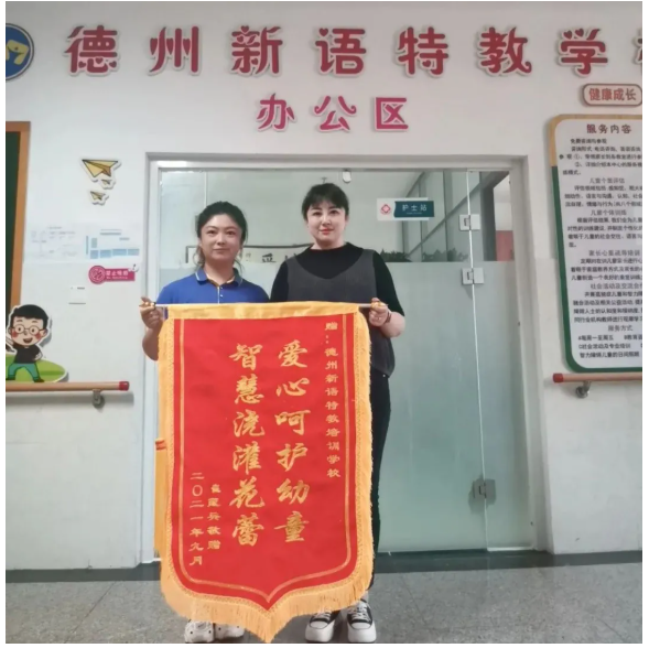 9月19日,中秋节来临之际,德州新语的老师们也收到了一份特别的礼物,涵涵(化名)爸爸送来了“爱心呵护幼苗,智慧浇灌花蕾”的锦旗,表达自己对学校和老师的感激之情。
