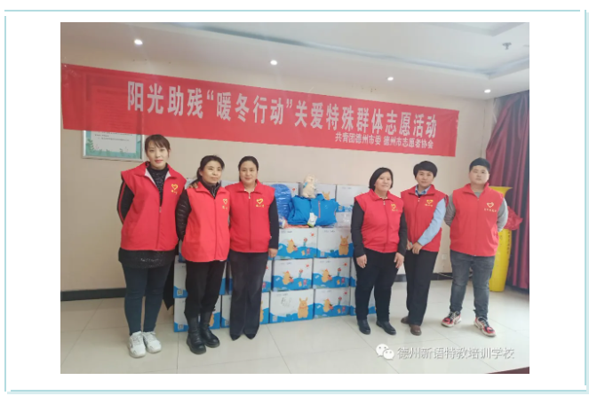2022年1月7日下午,德州市志愿者协会的志愿者们来到新语特教,给学校的25名贫困学生送来了“壹基金”温暖包。